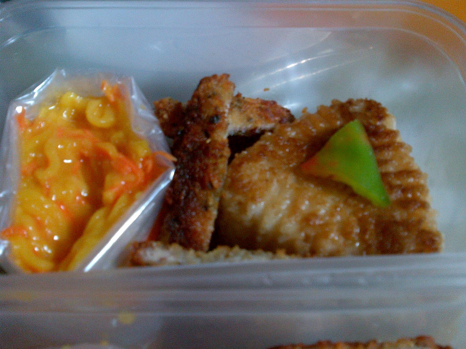 This so far isn't really good. Aside from the salad, everything else didn't give an oomph, nor looked very appetizing. I wasn't able to dress up my bento well, add the fact that I almost grated my thumb! It was a tough job to grate carrots and my finger won't stop bleeding!